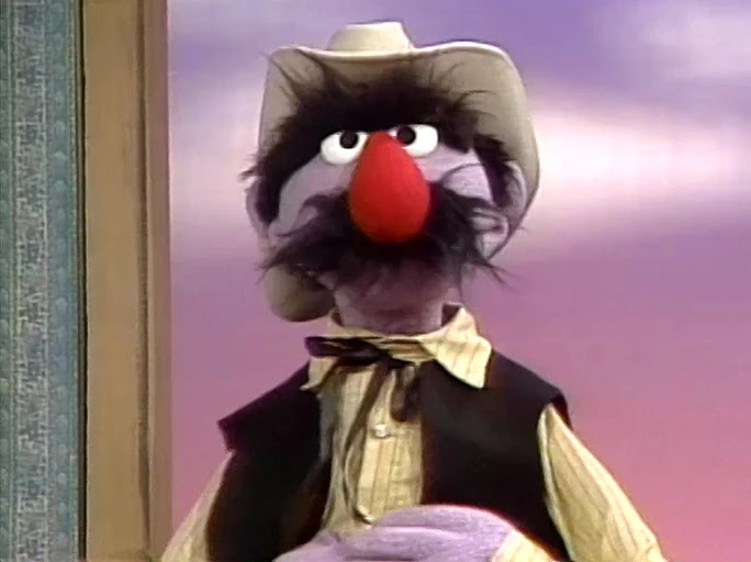 Sesame Street. He initially comes off as angry and mean, but by the end of the sketches he always turns out to be harmless. His attitude is very similar to the another cowboy character, Sinister Sam, and they are both made from the same large lavender live-hand Anything Muppet pattern.